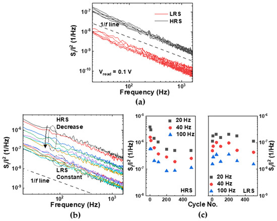 (a) The Si/I2 for several devices in both the HRS and LRS at 0.1 V. (b) The Si/I2 in both the HRS and LRS according to the RS cycle at the same read bias. (c) The change in the Si/I2 according to the RS cycle in both the HRS (left) and LRS (right) at the frequencies 20, 40, and 100 Hz.