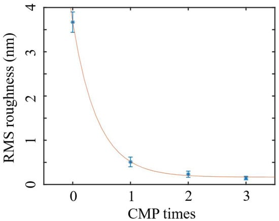 We also find the surface roughness after wet-oxidation-assisted CMP is related to the initial surface roughness before polishing. A second and a third CMP are tested on the same chip. Figure 2a,b show the AFM images of the surface profiles of the 4H-SiCOI chip after the second and the third CMP processes, which result in lower RMS roughness of 0.23 ± 0.07 nm and 0.15 ± 0.04 nm, respectively. Meanwhile, the standard deviation also becomes smaller with more CMP processes. We finally achieve a rather low standard deviation of 0.04 nm within the 2 cm × 2 cm area, indicating that the chip surface has very good uniformity. The surface roughness as a function of the cycles of the wet-oxidation-assisted CMP processes is plotted in Figure 3. It shows an exponential decay relationship, and the surface roughness of 0.15 nm almost reaches the minimal limit.