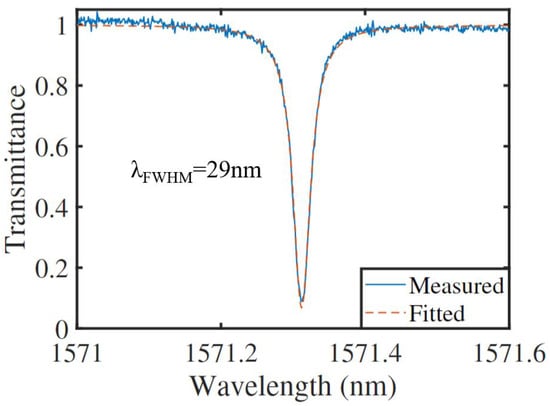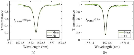 We measure the transmission spectrum of the resonance of the microrings fabricated in both unpolished and polished 4H-SiCOI chips at around 1572 nm, which is shown in Figure 5a and Figure 5b, respectively. The optical propagation loss in the waveguide can be extracted from the resonance spectrum of the microring resonators []. The quality factor of the microring can be calculated by