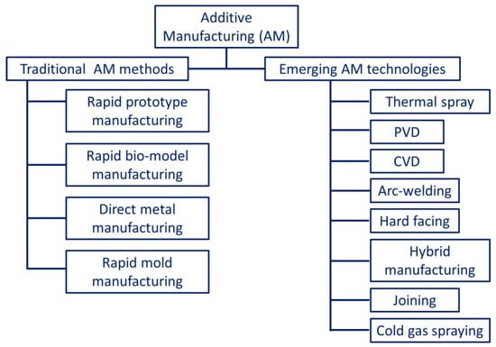 The idea of manufacturing parts through AM has been prevalent for a decade, and the applications include rapid prototyping, the generation of models for large-scale production, conducting different tests, and the validation of such models [3]. With the inception of the fourth industrial revolution, the direct manufacturing of products through AM emerged, including in the automotive, electronics, nuclear, aerospace, and bio-medical sectors. Unlike the available strategies such as servitization [4], presumption [5], and personalization [6], AM technology stands out as an effective manufacturing method among the leading industries. The AM process has gained popularity among researchers for the direct printing of parts, microstructure–property correlation, materials design, product design, and end utilization of the product [7,8,9]. Lately, AM has been used in conjunction with conventional manufacturing methods. Subtractive manufacturing accounts for controlled material removal from the substrate to obtain the final product, whereas in AM, layer-by-layer deposition takes place on the end surface [10]. As compared to traditional manufacturing methods, AM is intrinsically less harmful to the environment and leads to zero waste in terms of socio-economical value addition.
