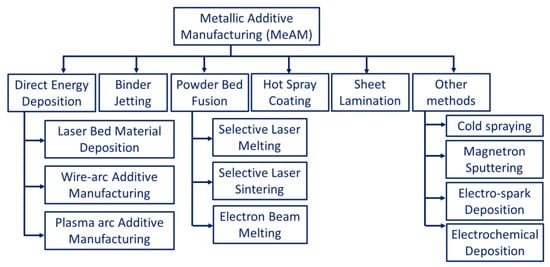 According to the American Society for Testing and Materials (ASTM International) standards, AM is classified based on the material used as feedstock, the state of fusion, the distribution of material, and the type of process [11]. As per ASTM standards, metal additive manufacturing (MAM) methods are broadly classified into direct energy deposition (DED)/powder-fed fusion (PFF) and powder bed fusion (PBF) processes. Apart from these, sheet lamination and binder jetting are also counted by ASTM as alternative MAM methods [12,13]. Some of the other potential methods include friction stir additive manufacturing [6,7], cold spraying [8,9], direct metal writing [10,11], and diode-based processes [14]. However, these techniques are still under consideration by ASTM to be included in the AM classification list. A generalized classification of the AM techniques is presented in Figure 1.