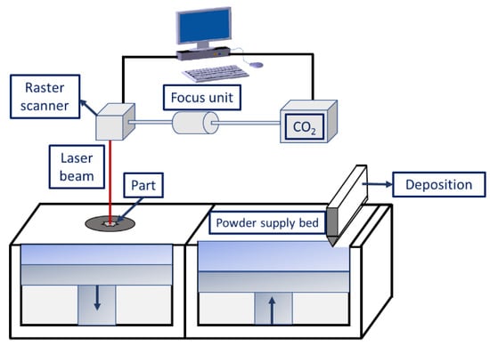 Selective laser sintering (SLS) is a typical AM method wherein layer-by-layer deposition takes place by spreading the powders, followed by their selective sintering. Figure 4 is a typical schematic diagram of the SLS process constituting a powder layering setup, laser source, system interface, and other accessories (i.e., preheating unit and inert gas protection system). The types of lasers used in the SLS process include Nd:YAG [94], CO2 [95], fiber lasers [96], disc lasers [97], etc. The appropriate choice of lasers affects the strengthening of the powders for the following reasons: