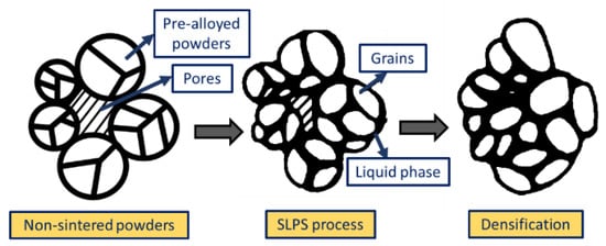 Zhu et al. [105] built multi-material components using pure Cu + SCuP (pre-alloyed) powders. SCuP powders act as binders owing to their lower melting point (i.e., 645 °C), whereas Cu takes the role of structural material due to its high melting temperature, 1083 °C, as shown in Figure 5a. In another study by Gu and Shen [106], a combination of higher-melting-point tungsten metal powders with copper metallic powders was fabricated through SLS. The densification behavior and the microstructural changes taking place during the SLS process were studied. Figure 5b shows the SEM images of the morphological changes occurring on the sintered samples at different line scan spacings. During melting and solidification, the pure metals with compatible melting points of pre-alloyed powders have a mushy (semi-solid) zone amidst the solidus and liquidus phases. With the optimization of the laser process parameters, it can be noted that the laser sintering temperature lies within the limits of the semi-solid zone, a process also known as supersolidus liquid-phase sintering (SLPS) [107]. As shown in Figure 6, the pre-alloyed power particles undergo extraneous melting and turn mushy as soon as an adequate amount of liquid is accumulated along the grain boundaries. The liquid wets the solid particles as well as the grain boundaries, thereby densifying the semi-solid system by the re-arrangement of the solid particles and precipitation of the solution. It is to be noted that the SLPS of the powders requires stern laser processing parameters to control the mushy zone. Localized and expeditious thermal cycles are generated during the laser sintering process. However, there are certain difficulties in controlling the laser sintering parameters, especially the temperature between the solidus and liquidus region, which seizes the SLPS mechanism. The problems encountered during the laser sintering operation, such as heterogeneity of microstructure, poor densification, an improper adaption of properties, etc., occur in the pre-alloyed powders. Thus, the post-processing of such parts manufactured through the laser sintering process needs careful attention. In this regard, several methods have been adapted to enhance the mechanical properties of the processed components. Some of the methods include hot iso-static pressing [108], furnace sintering [109], or secondary infiltration (in association with low-melting-point material) [110].