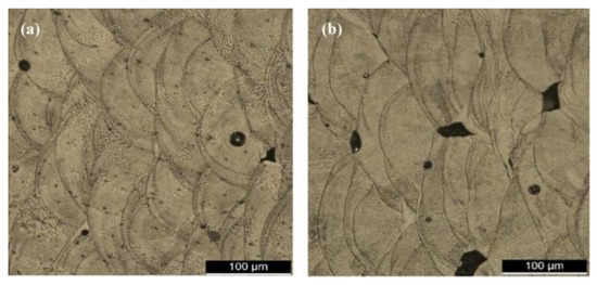Microstructure showing the presence of porosity in stainless steel samples fabricated by the SLM process as a function of different laser scanning speeds: (a) 200 mm/s and (b) 400 mm/s [114].
