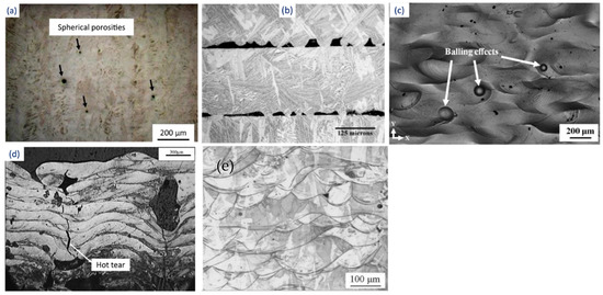 Defects generated during the SLM process: (a) porosity [135], (b) inadequate fusion between layers [136], (c) balling effect [137], (d) hot tear [133], and (e) fish scaling [138].