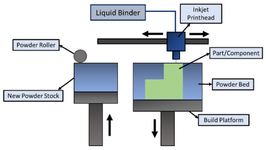 Binder jetting is a type of AM technology that involves multiple steps for the fabrication of 3D parts. The process was introduced in the early 1990s by the Massachusetts Institute of Technology (MIT) and was commercialized in 2010 [154]. This technology can process almost all metals/alloys/ceramic materials (glass, graphite, sand, etc.) from powder form. The process requires a base material (metal/alloy/ceramic) of which the part is to be made, along with a binding agent (liquid phase) for gluing the material in layers. The printing technique is like any other AM printing process that takes place layer by layer. The powder (metallic/ceramic) material is spread over the bed by a roller according to a computer-aided design (CAD). The printing head allows the recurrent deposition of the binder adhesive as dictated by the CAD data over the powder bed [155,156]. As shown in Figure 10, the bed platform is adjusted or lowered based on the set layer thickness. As soon as the powder is bound to the binder adhesive, another layer of material is spread onto the previous layer, tending towards the final part. The loose powders that are unused or do not adhere to the layer surround the part until the final product is achieved.