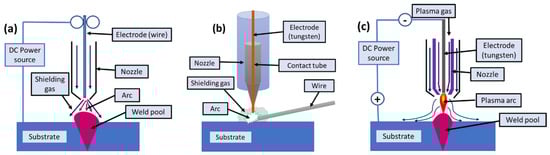 Wire arc additive manufacturing working principle using (a) MIG, (b) TIG, and (c) plasma arc welding [187].