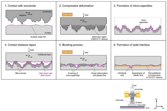 A schematic representation of the UAM joining process is presented in Figure 15. During the process, the sonotrode (tool/horn) generates micro-asperities in the form of surface roughness. Subsequently, the asperities collapse, shear, and material deposition takes place over the interfacial zone (<10 mm). Ref. [191] claims the roughness occurs due to shearing action which develops over the recrystallized zone. One of the advantages of the UAM process is the minimal heat generation at the deformation zone since localized deposition takes place in this process. The temperature is around 150 °C for Al- and Cu-based alloys, which could be used for fast-response thermocouples [192]. The deposition process can be carried out in an ambient atmosphere, and thus, solidification microstructures are absent.
