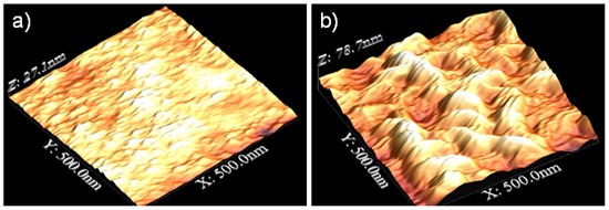 The results of the AFM images are shown in Figure 1. Surfaces that had been only polished had an RMS of about 4 ± 1 nm on a 500 nm × 500 nm area, while for surfaces after 120 s of exposition to plasma argon, RMS was 16 ± 5 nm at the same scale; therefore, the roughness increased when the pretreatment was applied.