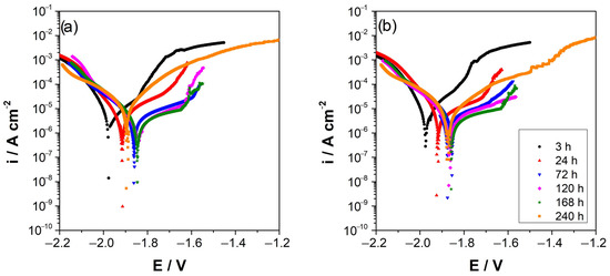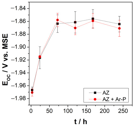 The open circuit potential (OCP) measurements of the AZ and AZ + Ar-P samples were performed after different exposure times to the electrolyte, up to a maximum exposure time of 240 h. The behavior of the OCP over time is presented in Figure 3. For exposure times of less than 48 h, the OCP moves progressively towards more positive values; for over 48 h of exposure to the electrolyte, the OCP reaches a constant value close to −1.86 V vs. SSE. This behavior of the OCP over time agrees with that reported by Leleu et al. [2]. OCP stabilization has been commonly attributed to developing a partially protective film on the metal surface composed of MgO/Mg(OH)2 [2,26,27,28]. The behavior of the pH with the exposure time at the surface-electrolyte interface also coincides with that reported by Leleu et al. [2]; the pH increases from 7 to ~10 after 24 h of immersion. The increase in pH may be related to the formation and dissolution of the Mg(OH)2 film and, consequently, to the release of OH- to the electrolyte, as described by Baril et al. [29]. According to previous studies, the maximum potential reached corresponds to the stabilization of the hydroxylated species and is related to a pH value of around 10.5 [30]. The OCP behaviors of the AZ and AZ + Ar-P samples are similar, which is related to the magnitude of the impact of the plasma pretreatment on the surface roughness. As revealed by the AFM micrographs in the Figure 2, the changes in roughness promoted by the plasma pretreatment are nanometers.