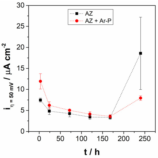 Evolution of anodic current density at +50 mV vs. EOC, in the pseudo-passive range for AZ and AZ + Ar-P samples.