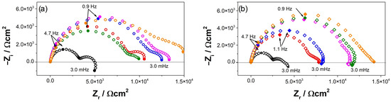 Nyquist diagrams evolution of (a) AZ and (b) AZ + Ar-P samples in 0.1 M of Na2SO4, (○,◊) 3 h, (○,◊) 24 h, (○,◊) 72 h, (○,◊) 120 h, (○,◊) 168 h, and (○,◊) 240 h.