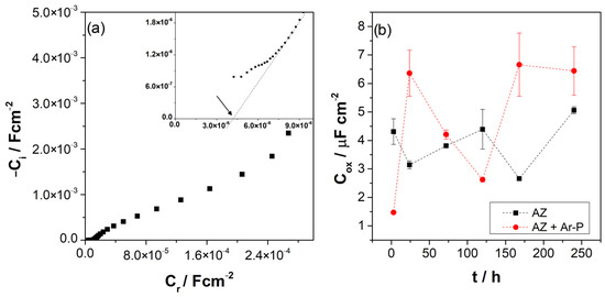 where ω = 2πf, Z is the imaginary part of the impedance, and Re is the resistance of the electrolyte, which can be determined by extrapolating the impedance in the HF to the real axes of the Nyquist diagram, as reported in Table 3. Figure 7a shows the complex capacitance, which allows the estimation of the oxide capacitance (Cox). Table 3 and Figure 7b show the evolution of these values. For AZ samples the value of Cox varied around 4 μF cm2. For AZ + Ar-P samples, the Cox values showed a higher variation, between 1 to 7 μF cm2, which can be attributed to the higher reactivity of the surface due to the argon plasma effect. It has been reported that the Cox can be associated with the thickness of the oxide, with the relationship: