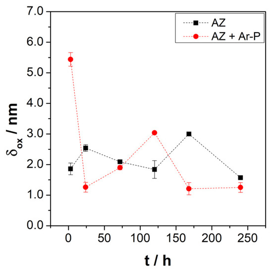 Figure 8 shows the evolution of the layer thickness during exposure, revealing a low variation in the oxide thickness for both samples, varying from 1.6 to 3.0 nm for the AZ sample, which increased from 1.2 to 5.4 nm for the AZ + Ar-P sample. The thickness changes slightly with the immersion time, revealing the formation and detachment of this layer.