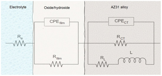 Figure 9 shows the equivalent circuit and physical model proposed for a better understanding of the corrosion process of AZ31 alloy immersed in 0.1 M of Na2SO4 solution, showing the influence of the plasma argon pretreatment. In this case, Re is the resistance of the electrolyte between the working and the reference electrode, RCT represents the charge transference resistance, CPECT is the double layer and MgO barrier film capacitance, Rfilm and CPEfilm represent the diffusion of Mg2+ and oxygen through the outer film (Mg(OH)2), L represents the inductance, and RL is the inductance resistance caused by the intermediate species on the surface of the alloy without a corrosion layer, as explained above.