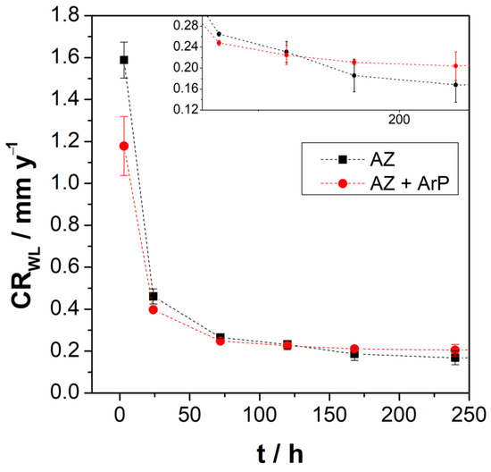 Figure 5 shows the anodic current density of AZ + Ar-P samples at E = Eoc + 50 mV after 3 h of immersion (iη = 50 mV), revealing that it was higher for AZ + Ar-P than AZ samples, which can be explained by the initial reactivity of the surface. After 24 h the iη = 50 mV was stabilized for both samples, however, after 240 h of immersion, the iη = 50 mV of AZ samples increases, as well as the dispersion of the results. According to Feliu et al. [36], the great dispersion in the samples can be caused by the growth characteristics of the corrosion products, which are extremely sensitive to fortuitous and minimal variations in the film formation process. This could indicate that the pretreatment leaves a more stable surface.