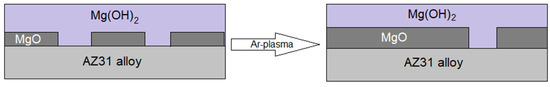 In summary, surface analysis shows that argon plasma pretreatment increases the amount of oxygenated species over hydroxylated ones. The results obtained with the electrochemical measurements confirm a greater coverage of MgO on the alloy surface, which is reflected in a more significant protective character of the oxide film that covers the surface of the alloy. The increase in initial reactivity of the surface promotes an increase in the thickness of the surface film in the first hours of exposure to the electrolyte, decreasing the corrosion rate, verified by mass loss measurements. This can be seen schematically in Figure 11.