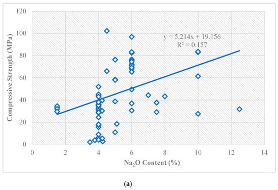 The most comprehensive 28-day compressive strength data for various one-part geopolymer pastes was collected from accessible, pertinent data in the open literature [17,18,19,20,21,22,23,24,25,26,27,28]. The database comprises 80 FA/GGBS binder-based one-part geopolymers made with an anhydrous sodium silicate alkaline source, see Table 1.