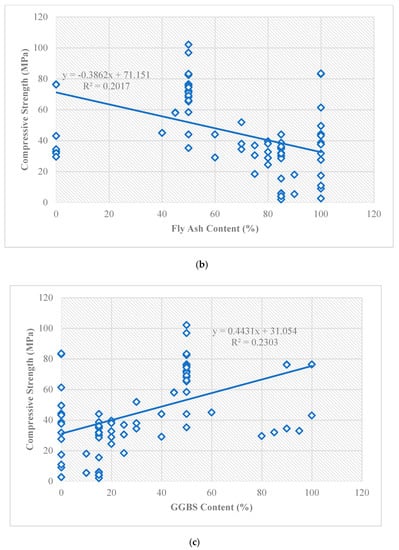 The low correlation coefficients in Figure 2 acknowledge that the investigated variables interact with each other in a complex way and therefore is difficult to capture this relationship with a simple regression equation. In such cases, alternative statistical methods may be more appropriate for modeling the relationship between the investigated variables and 28-day compressive strength. For example, non-linear regression models or machine learning algorithms, such as decision trees or neural networks, could potentially capture the non-linear relationship and underlining mechanism between these variables.