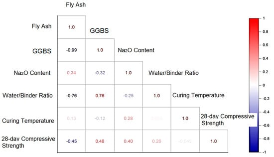 Correlation or dependency denotes any mathematical relationship, regardless of causation, between two random variables. Correlation measures the strength of the linear association between two variables. A correlation matrix is a tabular representation of the correlation coefficients between the input variables, displaying the relationship between each pair of variables in a table cell. A correlation matrix is useful for summarizing input data for further analysis. Figure 3 illustrates the correlation matrix of the input/output parameters utilized in the present study. Equation (1) was used to normalize each parameter in the range of 1 to −1 while considering each input parameter’s domain and preventing any divergence in the results. Xn is the normalized value of the parameter, where Xmax is its maximum value, and Xmin is its minimum value. X is the variable’s original (non-transformed) value. Table 2 provides the maximum and minimum values for each input parameter. The results of the correlation matrix acknowledge that GGBS and the Na2O contents had significant effects on the 28-d compressive strength.