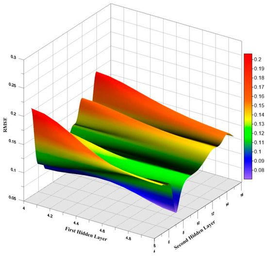 After numerous iterations, the best-performing ANN model was identified as the one using the trainlm function in MATLAB with 5 and 7 neurons in the hidden layers. The performance of the developed models was evaluated using statistical indices, including RMSE, MSE, MAE, and correlation coefficient R, with the results shown in Figure 4. From the figure, it is evident that the network with 5 and 7 neurons in the hidden layers yielded the best RMSE values, which were 0.049.