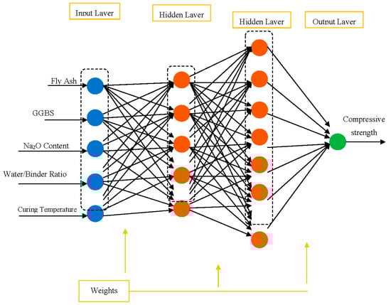Overall, using multiple key phases, as shown in Figure 6, the ANN was used to forecast the 28-day compressive strength of developed geopolymer mixes. In the beginning, the data were split into two groups with a 7:3 ratio, with 70% of the data used to create the training dataset and the remaining 30% used to create the testing & validation dataset. Second, the ANN model was constructed using a training dataset (two hidden layers). Third, in order to validate and assess the effectiveness of the suggested ANN model, the projected outcomes were contrasted with the experimental data using several metrics, including mean absolute error (MAE), root mean square error (RMSE), and coefficient of determination (R2).