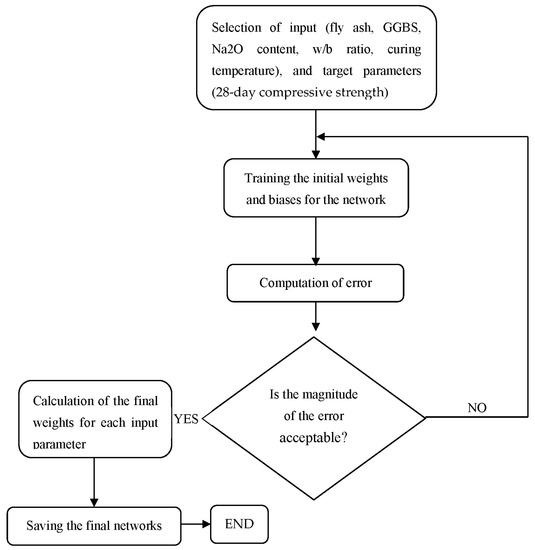 In order to predict the 28-day compressive strength of one-part geopolymer pastes, an artificial neural network (ANN) was developed using the MATLAB ANN toolbox. The network consisted of five neurons in the input layer, one neuron in the output layer representing compressive strength, and two hidden layers containing various numbers of neurons. The feed-forward neural network was trained using the trainlm function to create an effective network. The transfer functions used were “tansig” or “hyperbolic tangent sigmoid” for the hidden layers and “purelin” or “Linear” for the output layer.