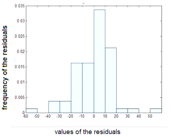 In this equation, the p-value is less than 0.05, indicating that the coefficients are satisfactory. However, the value of R-square and the RMSE was calculated at 0.563 and 16.8, respectively, indicating that the MLR analysis method unable to capture the underlying mechanism of the data. Figure 7 also shows the histogram of residuals of the stepwise regression performed in this study, demonstrating the frequency distribution of the differences between the predicted values and the actual values of the dependent variable. Residuals are the differences between the observed values of the dependent variable and the predicted values based on the regression equation. The histogram of residuals is used to evaluate the assumption of the normality of residuals. The horizontal axis of the histogram of residuals represents the values of the residuals, which are the differences between the predicted values and the actual values of the dependent variable. These residuals are typically standardized, with a mean of 0 and a standard deviation of 1, making it easier to compare residuals across different models or datasets. The vertical axis of the histogram represents the frequency of the residuals at each value. This frequency represents the number of data points that have a residual in the corresponding range. The height of each bar in the histogram indicates the number of data points with a residual value in that particular range.