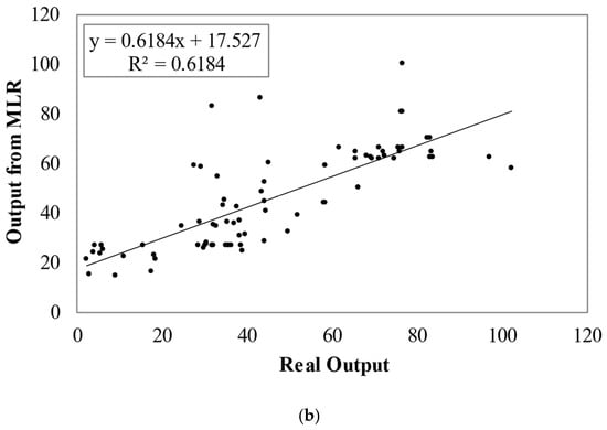 Determining the connection between two or more variables is a common task in engineering. Regression analysis is one of the effective statistical techniques that has consistently piqued scientists’ interest in this field. Regression modeling is generally thought of as the process of fitting models to data. Linear predictor functions are generated in a linear regression model to determine the relationship between the input/output parameters. It is important to note that several input variables are often used in regression analysis applications, creating “multiple linear regression” or MLR functions. In this instance, MLR analyzes the observed data and fits it into a linear equation to determine the correlation between two or more input variables. Multiple linear regression involves summarizing data and investigating the relationship between variables [40,41]. The general formula for multiple regression models is given in Equation (7) below, where Y is a dependent variable, β0 is a constant, and βj is a regression coefficient (i = 1, 2,…, n).