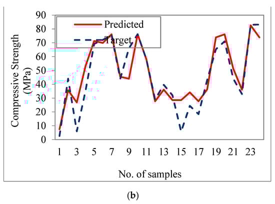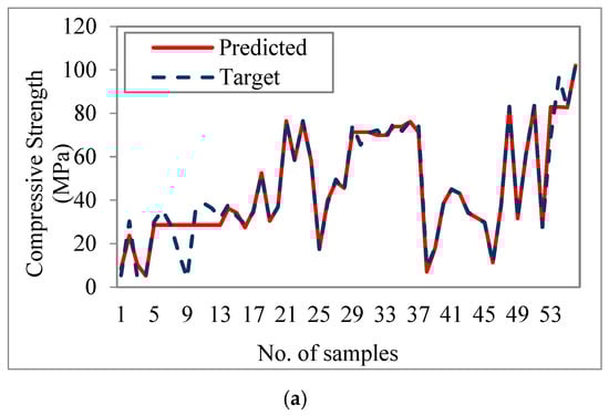 The experimental data (represented by the discontinuous blue line) and the predicted values (represented by the continuous red line) from the training and testing data of the ANN algorithms are shown in Figure 9. The predicted compressive strength of the ANN model matched well with the target values, which is supported by both the training part (70% of data) and the validation/testing part (30% of data) for the ANN algorithms.