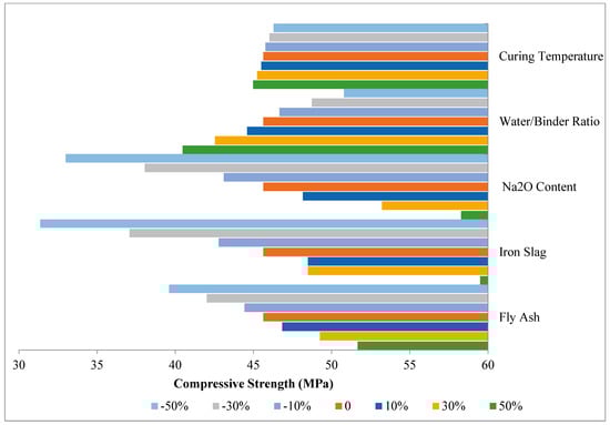 The sensitivity analysis is shown in Figure 10. The results indicate that the Na2O and GGBS contents significantly influenced the 28-day compressive strength. For instance, decreasing the GGBS by 50% led to a sharp decrease in compressive strength, estimated at around 31 MPa, while a significant increase in compressive strength of 59.5 MPa was estimated for a 50% increase in GGBS. The Na2O content also played an important role in compressive strength; the larger the Na2O content, the higher the compressive strength. On the other hand, a lower water/binder ratio led to higher compressive strength, as expected.