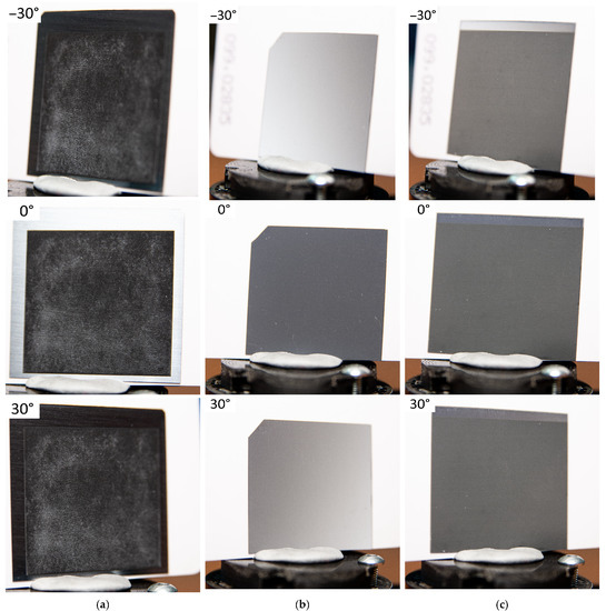 Figure 1 shows optical images of the surface of processed silicon samples at angles of −30°, 0° and 30°. In addition, supplementary materials contain videos demonstrating the treated surface in the range of angles from −60° to 60° with step 10°. It is also worth noting the presence of white microdispersed particles (Figure 1a), which appeared as a result of cleaning sample #1. Such a defect can be caused by the wrong choice of the liquid in which the cleaning took place. During laser processing, the average power of the applied pulses and the focusing spot were 0.11 W, 70 µm (Figure 1a) and 0.024 W, 20 µm (Figure 1c) for samples #1 and #3, respectively; pulse repetition rate—1 kHz, 240 kHz. The scanning speed and step were 0.5 mm/s, 60 µm for sample #1 and 300 mm/s, 10 µm for sample #3. It should be noted that during laser texturing of sample #3 compared to sample #1, despite the lower applied radiation power and smaller focusing spot, the processing time was reduced by a factor of 5 (the processing time regarding the square area of 25 × 25 mm2 in size) due to the high scanning speed, which may indicate the possibility of improving the technology of hybrid chemical/laser fabrication of structures for ultrafast processing of the silicon surface using, for example, cylindrical lenses [33]. In addition, such a difference in processing time is associated with the presence of a previously chemically formed relief, on which laser processing is much faster. Optical images of the surfaces of samples #1 and #3 (Figure 1a,c), obtained using laser radiation, clearly show the coloring of the silicon surface in black. In this case, the surface of the chemically treated sample #2 (Figure 1b) has a characteristic blue tint, which may indicate a significantly greater reflection of the short-wavelength region of the visible spectrum than that of samples #1 and #3.
