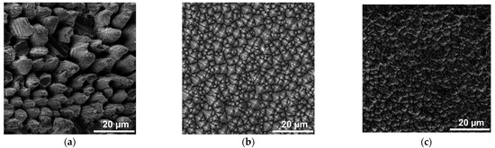 SEM images of structures: (a) Sample #1—laser texturing of a silicon cut; (b) Sample #2—chemical etching; (c) Sample #3—hybrid chemical/laser fabrication.