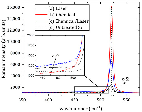 Raman spectra of silicon surface: (a) Sample #1—laser texturing of a silicon cut; (b) Sample #2—chemical etching; (c) Sample #3—hybrid chemical/laser fabrication; (d) Untreated Si.