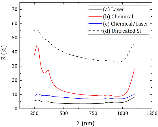 Total reflectance of silicon surface: (a) Sample #1—laser texturing of a silicon cut; (b) Sample #2—chemical etching; (c) Sample #3—hybrid chemical/laser fabrication; (d) Untreated Si.