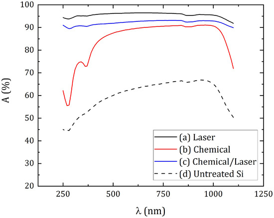 Absorptance of silicon surface: (a) Sample #1—laser texturing of a silicon cut; (b) Sample #2—chemical etching; (c) Sample #3—hybrid chemical/laser fabrication; (d) Untreated Si.