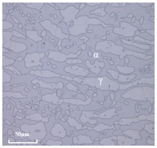 According to ASTM A923-2014, the polished sample of 2205 was etched in 40 g reagent grade NaOH plus 100 g water solution weight at 2 V DC for 20 s to obtain the structure in Figure 1. It can be seen that the microstructure of 2205 duplex stainless steel consists of an elongated austenite phase (γ, light color) inlaid on a ferrite matrix (α, Dark), the two phases are evenly distributed, and the contents of ferrite and austenite phases are 49.13% and 50.87% respectively.