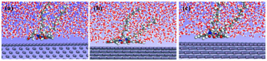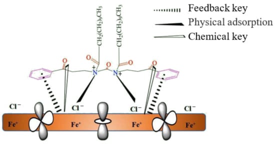 The adsorption behavior of the corrosion inhibitor and Fe surface in an aqueous solution was simulated by molecular dynamics, and the kinetic equilibrium configuration of the corresponding system at different temperatures was obtained (Figure 3). Figure 4 shows the adsorption mechanism of organic corrosion inhibitors on the iron surface. The combination of chemical adsorption and physical adsorption could form a protective film to reduce the corrosion of acid solution on the metal surface. When the corrosion inhibitor interacts with the iron surface, the O and N atoms in the benzene ring and molecule are close to the iron surface and tend to adsorb on the iron surface in parallel to form an adsorption layer. The alkyl chain deviates from the iron surface at a certain angle to form a thicker hydrophobic layer (Figure 3 and Figure 4). With the increase in temperature, the planarity of adsorption between the benzene ring and the iron surface becomes weaker, indicating that the adsorption capacity of the molecule and iron surface would decrease with the increase in temperature (Figure 3c).