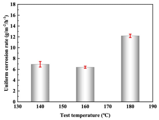 Figure 5, Figure 6 and Figure 7 show the uniform corrosion rate, inhibitor film thickness, and local corrosion depth of 2205 duplex stainless steel in acid solution at 140 °C, 160 °C, and 180 °C, respectively. It can be seen that the uniform corrosion rate shows no significant difference between 140 °C and 160 °C but rises sharply at 180 °C, which is twice that at 160 °C, which is far lower than the commonly accepted 81 g·m−2·h−1 [41] and 26.8053 g·m−2·h−1 of the 2205 duplex stainless steel in the reported 120 °C 15 wt.% HCl + 1.5% wt. HF + 3 wt.% HAC + 5.1 wt.% acid corrosion inhibitor [12]. The thickness of both layers showed a decreasing trend with the increase in temperature. When combined with the local corrosion and the morphology of the corrosion inhibitor film, it can be seen that the density of the film decreases with the increase in temperature.
