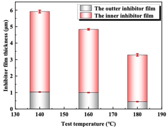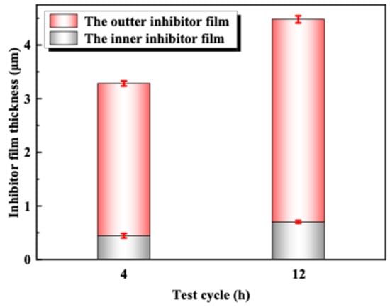 The uniform corrosion rate of 2205 duplex stainless steel after 4 h and 12 h tests in acid solution at 180 °C is shown in Figure 9. It can be seen with the extension of test cycles, and the corrosion rate generally shows a decreasing trend. Figure 10 shows the thickness of two corrosion inhibitor film layers at different test cycles. With the extension of the test cycles, the thickness of the two layers displays an increasing trend. According to the local corrosion situation and the micro-morphology of the inhibitor film, although the film thickness increases with the increase in temperature, the compactness decreases, and the localized corrosion density and depth increase.