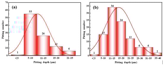 Normal distribution of pitting depth on the surface of samples at different test cycles (a) 4 h; (b) 12 h.