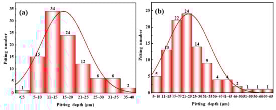 Figure 12 and Figure 13 display the statistical results of pitting depth and the surface microscopic corrosion morphology of samples after different test cycles. It can be seen from Figure 12a that the maximum pitting depth is 37 μm, the average pitting depth is 16 μm, and the depth of the corrosion pit is mainly concentrated at 11~15 μm at 180 °C for 4 h. The maximum pitting depth is 64 μm, the average pitting depth is 23 μm, and the depth of the corrosion pit is mainly concentrated in 21~25 μm at 180 °C for 12 h (see Figure 12b).