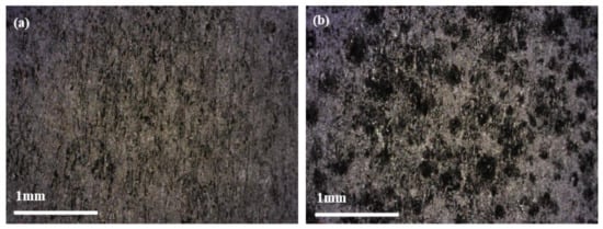 Micromorphology of sample surface magnified by 100× under optical microscope at different test cycles: (a) 4 h, (b) 12 h.
