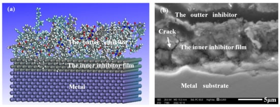 In the acid solution system with high temperature and high concentration, the common organic corrosion inhibitor is seriously desorbed at high temperature, and its adsorption capacity differs greatly from that of austenite and ferrite, which is prone to selective corrosion and difficult to play a good protective role. The corrosion inhibitor in this study constructs a double-layer membrane adsorption structure, which uses inorganic substances with good stability at high temperature to form a complex with the metal matrix to enhance the binding ability with the metal matrix and maintain the high-temperature stability of the film. However, the inorganic film is not dense enough; organic film is used to supplement, as shown in Figure 14a. The microscopic morphology of the film cross-section after adding corrosion inhibitor in the 180 °C acid solution is displayed in Figure 14b. It can be seen the inhibitor has a double-layer membrane structure, which is consistent with the expected results of the inhibitor mechanism. Inorganic salt has a good binding ability with metal matrix at high-temperature. However, the film is easy to crack at high-temperature and forms a channel for acid diffusion. The crack defect could be repaired by the organic film, making the corrosion inhibitor film more dense and better protective for the matrix.