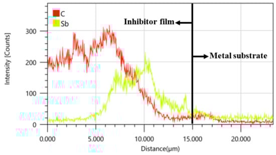The cross-section of the line scan results of the corrosion inhibitor film is shown in Figure 15. The outer film and the inner film is mainly composed of element C and Sb, respectively, which is consistent with Table 5. From the results of line scanning, it can be seen that the organic film and the inorganic salt film penetrate into each other and combine closely.