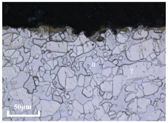 Figure 16 shows the cross-section morphology of 2205 duplex stainless steel after testing in 180 °C acid solution with a corrosion inhibitor. No selective corrosion was observed. Figure 17 shows the XRD analysis results of the sample surface after the 180 °C test without corrosion inhibitor and with corrosion inhibitor. The peaks of the austenitic phase are much stronger than that of the ferritic phase in tests without the corrosion inhibitors. However, the peaks of the ferritic phase are as strong as those of the austenitic phase when the corrosion inhibitor is added. The results show that without adding a corrosion inhibitor, selective ferrite corrosion could be observed in high-temperature and high-concentration acid solutions, and selective corrosion is effectively inhibited after adding a corrosion inhibitor.