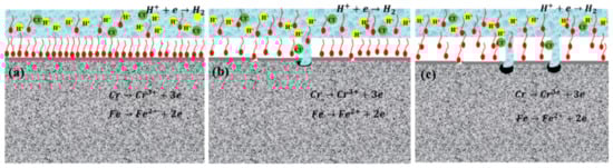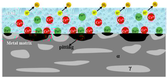 Figure 18 shows the corrosion mechanism of duplex steel in a high-temperature and high-concentration acid solution system. Minor differences could be seen in the element composition of 2205 duplex stainless steel. Cr, Mo, Ni, and N tend to be concentrated in the ferrite and austenite phases, respectively [26,42,43]. The distribution of elements in the phase is a key factor affecting selective corrosion. The 2205 duplex stainless steel is in an active state when working with high-temperature and high-concentration hydrochloric acid and hydrochloric acid plus hydrofluoric acid [12,26]. Because the potential of Cr is more negative than that of Fe, Cr is more likely to lose electrons and form ions than Fe, and the corrosion of ferrite is more serious than that of austenite. The possible chemical reactions are: