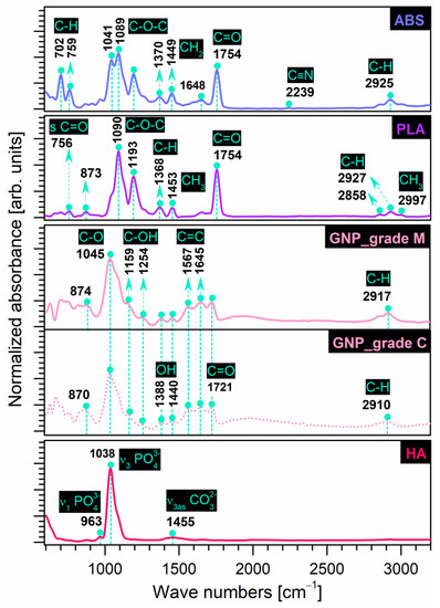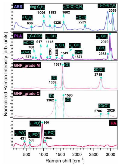 As such, the complementary FTIR-ATR and Raman investigations exposed only bands assigned to the characteristic vibrational modes, free of any traces, impurities, or other molecules/compounds, in the case of both the prime (ABS and PLA) and the reinforcement materials (GNP—grade C vs. grade M clearly delineated, and bovine bone derived HA).