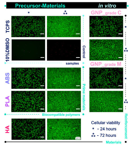 Based on the results of the in vitro cytocompatibility tests as a whole, we can establish the necessity to exclude the GNP_grade C and ABS precursor materials from the technological protocol for developing composite filaments in close regard to the biological requirements for biomedical applications.