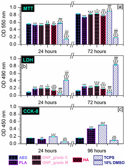 The final biological assessment enabled the exclusion of only one material from each category: the ABS and GNP_grade C samples, due to their pronounced cytotoxic effect. The direct contact tests performed only on the polymeric plates further confirmed the significant cytotoxic potential of the ABS material as compared to the PLA material. Thus, in our next study, we will proceed with the development of composite filaments based on PLA (as the polymeric matrix), reinforced with both GNP_grade M and HA, in close regard to the requirements for biomedical applications in the orthopaedic and dental fields.